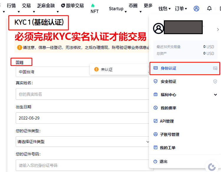Gate.io注册完成后,进行法币充值前必须完成身份认证。按官网指示,在“身份认证”中上传身份证和ID照,认证通过后便可充值交易。