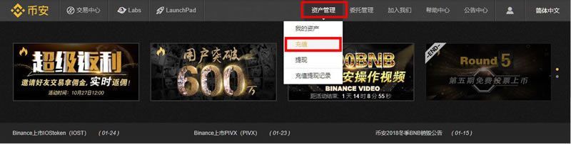 登录币安官网,选择“资产管理”-“充值”,然后选择所需币种(此处以充值主流币种ETH为例)。